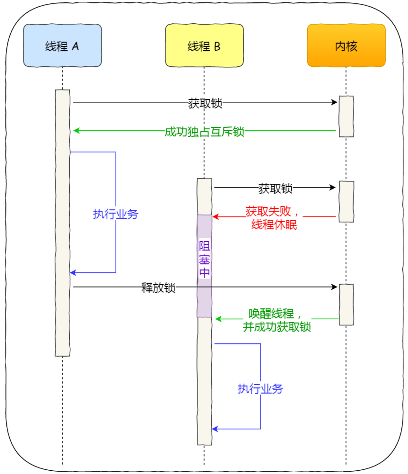 对于互斥锁加锁失败⽽阻塞的现象,是由操作系统内核实现的。当加锁失败时,内核会将线程置为「睡眠」状态,等到锁被释放后,内核会在合适的时机唤醒线程,当这个线程成功获取到锁后,于是就可以继续执⾏。如下图: