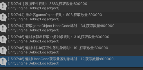 方式1的耗时:重命名gameObject+通过字符串查找业务对象; 耗时 503+316 毫秒 方式2的耗时:给gameObject添加组件+通过id查找业务对象; 耗时 3883+191 毫秒 方式3的耗时:gameObject获取HashCode+通过HashCode查找业务对象;耗时 34+12 毫秒