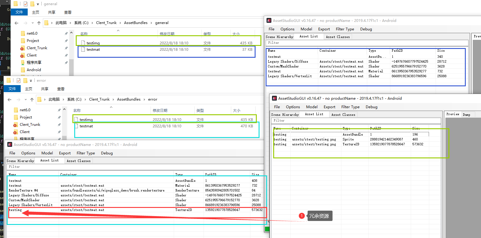 材质球引用的纹理Texture 且Texture是Sprite资源,这时候Texture单独一个AB文件,材质球是另一个AB文件,则会出现冗余