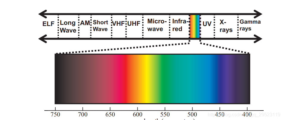 光是一种横向传播的电磁波,电磁波的波长范围非常广,但只有390~760nm之间的一段波谱是人眼可见到的,也就是在图形学里对渲染着色起作用的部分。另外因为光有波粒二象性的缘故,有时候我们在图形学里也会把光做为光子(photon)来处理。