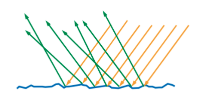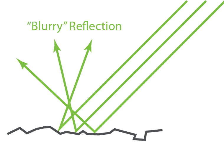 为表面细节最容易在反射中被观察到(散射并不会被太多的影响到,这里不会讨论到)。上图中,入射光的平行线当从粗糙的表面反射是发生了交叉,因为每一条射线遇到的表面方向都不一样。就像将球抛向墙面一样,如果墙面非常不平整,球任然会反弹,但是反弹方向是不可预测的。简而言之,表面越粗糙,越多的反射光线会产生交叉,看上去越“模糊”。