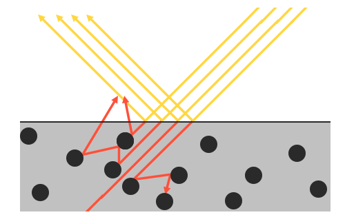 折射进物体内部的光如果没有被立即吸收,将会持续前进,与物体内部的微粒产生碰撞,每次碰撞有一部分能量损耗转化成热能,直至光线能量全部消耗。有些折射光线在跟微粒发生若干次碰撞之后,从物体表面射出,便会形成漫反射光。