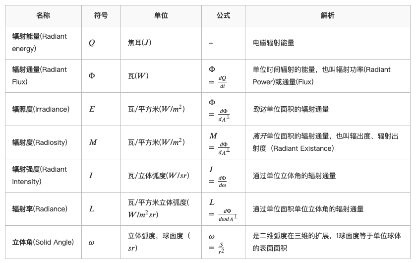 先用一个表展示辐射度量学涉及的概念、名词、公式等信息,后面会更加详细地介绍。