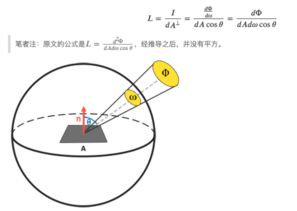 辐射强度Φ的光源在单位面积A,单位立体角ω上的辐射出的总能量: