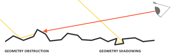 shadowing现象 因为微几何体的构造缘故,一些入射光的平面点被内部遮挡,成为了内部阴影而无法接受光照(也就不能反射光)。