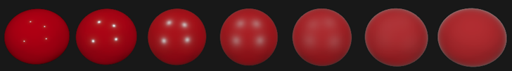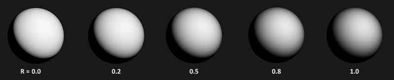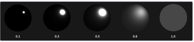 我们可以看到,较高的粗糙度值显示出来的镜面反射的轮廓要更大一些。与之相反地,较小的粗糙值显示出的镜面反射轮廓则更小更锐利。
