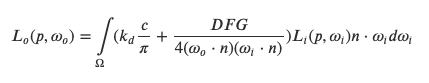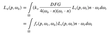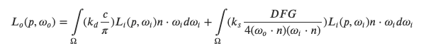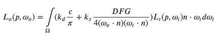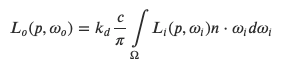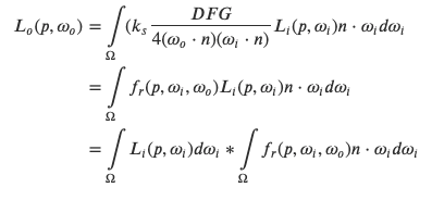 仔细分析上面方程的漫反射积分部分,发现Lambert漫反射是个常量项(颜色𝑐,折射因子𝑘𝑑和𝜋)并且不依赖积分变量。因此,可见常量部分移出漫反射积分: