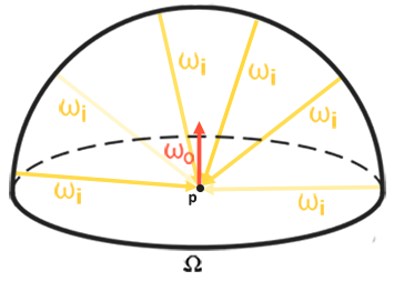 为了卷积环境图,我们要解决每个输出𝜔𝑜采样方向的积分,通过离散地采样大量的在半球Ω的方向𝜔i并取它们辐射的平均值。采样方向𝜔i的半球是以点𝑝为中心以𝜔𝑜为法平面的。