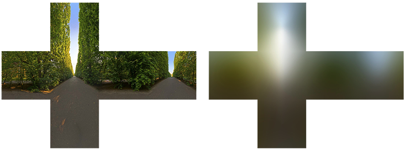 对第一个要求,相对简单,采用环境cubemap。给定一个cubemap,可以假设它的每个像素是一个单独的发光光源。通过任意方向向量𝜔𝑖采样cubemap,可以获得场景在这个方向的辐射。