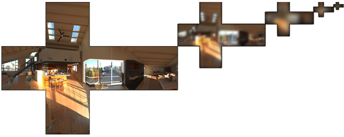 对每个卷积的粗糙度等级,循环地在预过滤环境图的mimap等级存储更加模糊的结果。下图是5个不同粗糙度等级的预过滤环境图: