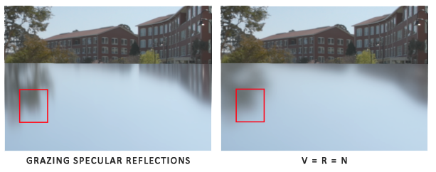 这种方式预过滤环境图卷积不需要关心视线方向。这就意味着当从某个角度看向下面这张图的镜面表面反射时,无法获得很好的掠射镜面反射(grazing specular reflections)。然而通常这被认为是一个较好的妥协: