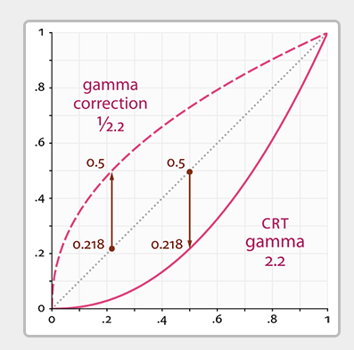 点线代表线性颜色/亮度值(译注:这表示的是理想状态,Gamma为1),实线代表监视器显示的颜色。