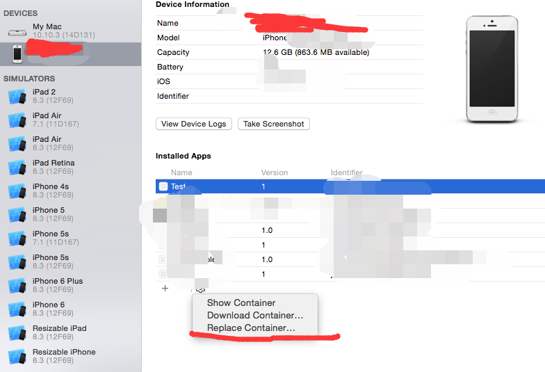 1.连接你的设备,在Xcode下点击 Window —> Device(cmd + shift + 2) 弹出窗口,选择你的设备,找到你已安装的APP,选中你想要查看沙盒的APP。