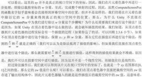 ComputeScreenPos在顶点着色器中没有做除以 clipw 的操作,需要在片元着色器进行除以 clipw 操作。