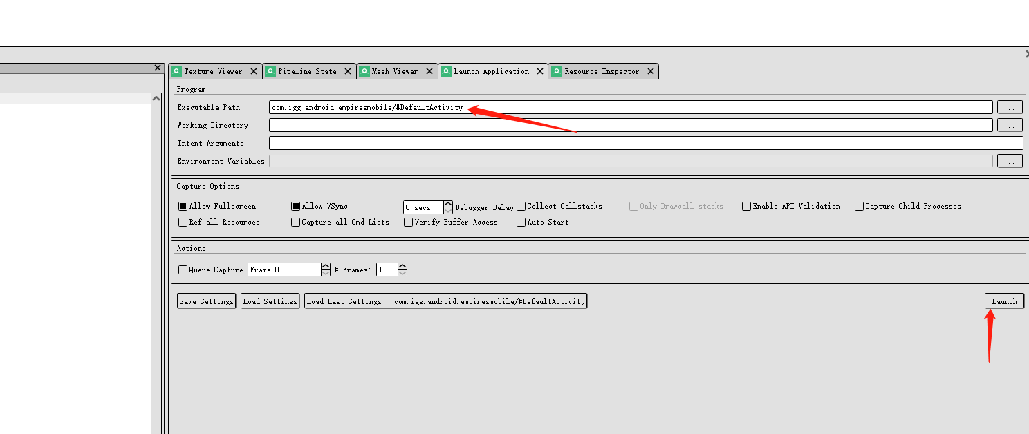 在 RenderDoc 的 Launch Application 页面里面。Executable Path 选择刚才找到的模拟器核心。然后在下面