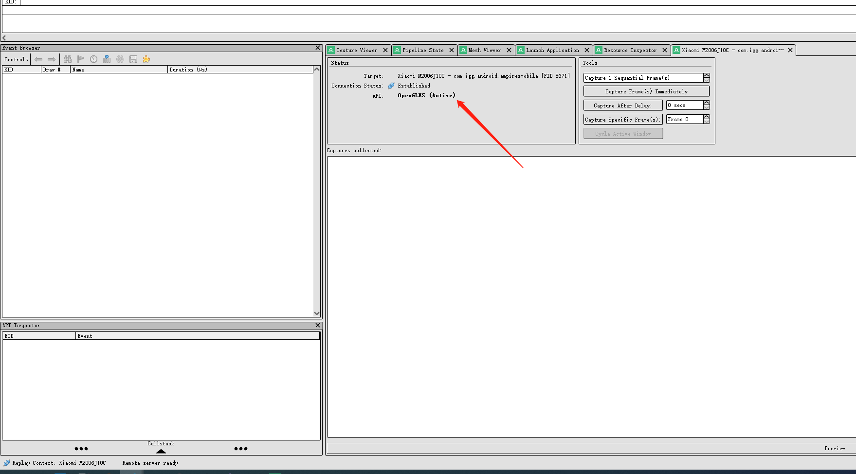 - RenderDoc File 菜单 Attach to Running Instance , 在 localhost 下面可以看到模拟器核心程序,选中并点击 Connect to app ,之后就正常抓帧即可。