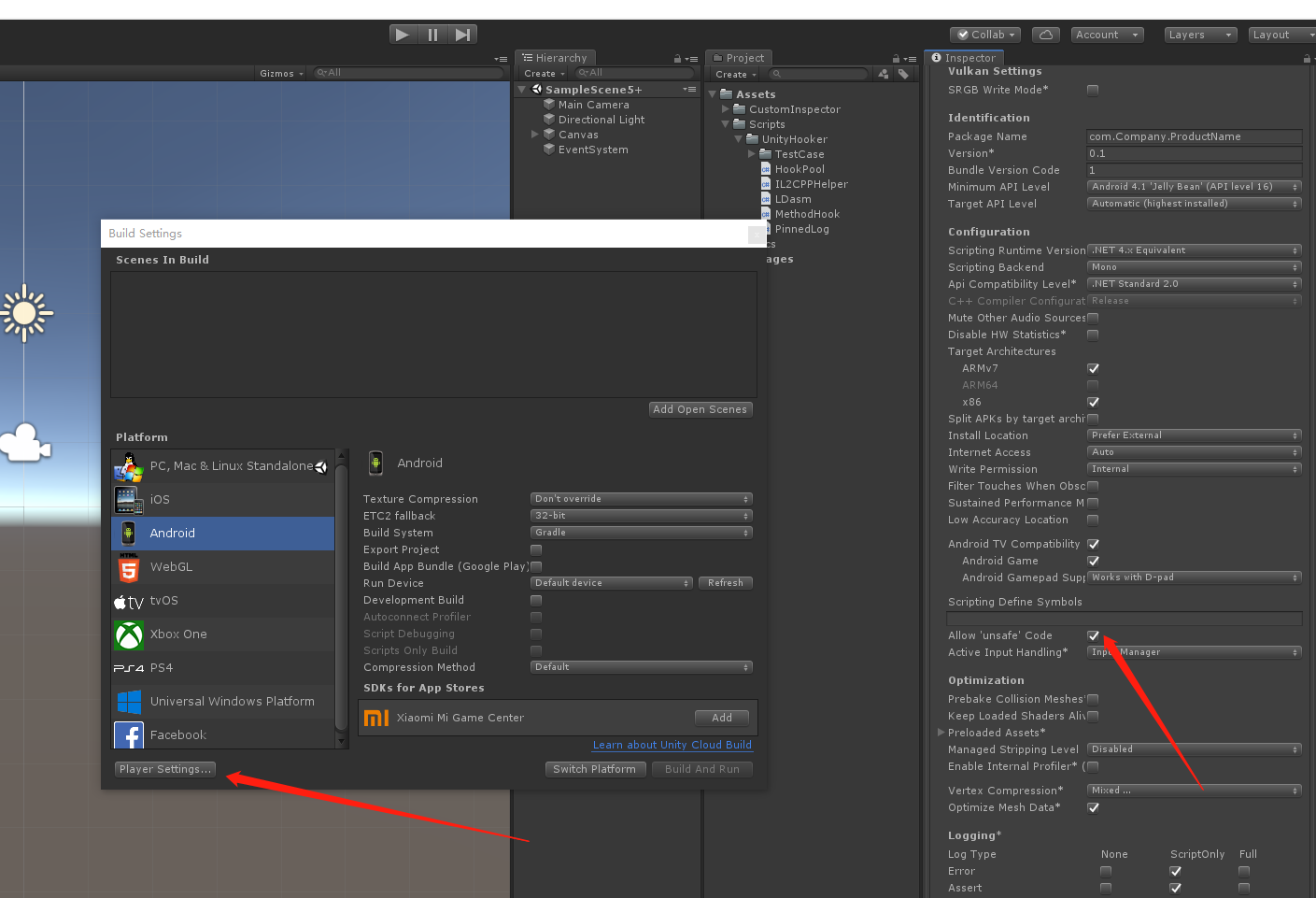 MonoHook插件需要打开unsafe宏定义,Build Setting-->Player Setting--> 勾选 Allow unsafe Code 如图: